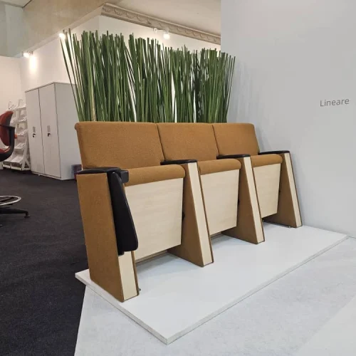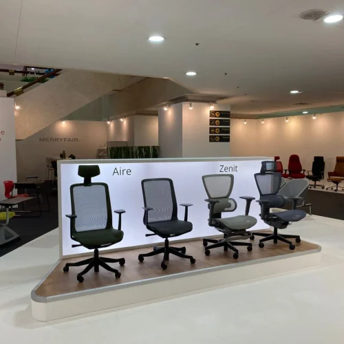 The booth opens with WAU. Inspired by ski boots and sports car bucket seats, it’s Merryfair’s most opinionated design to date. Alongside it, you’ll find the eco-conscious Aire, built using recycled materials throughout, and the full mesh Zenit, a consistent favourite among designers and specifiers.