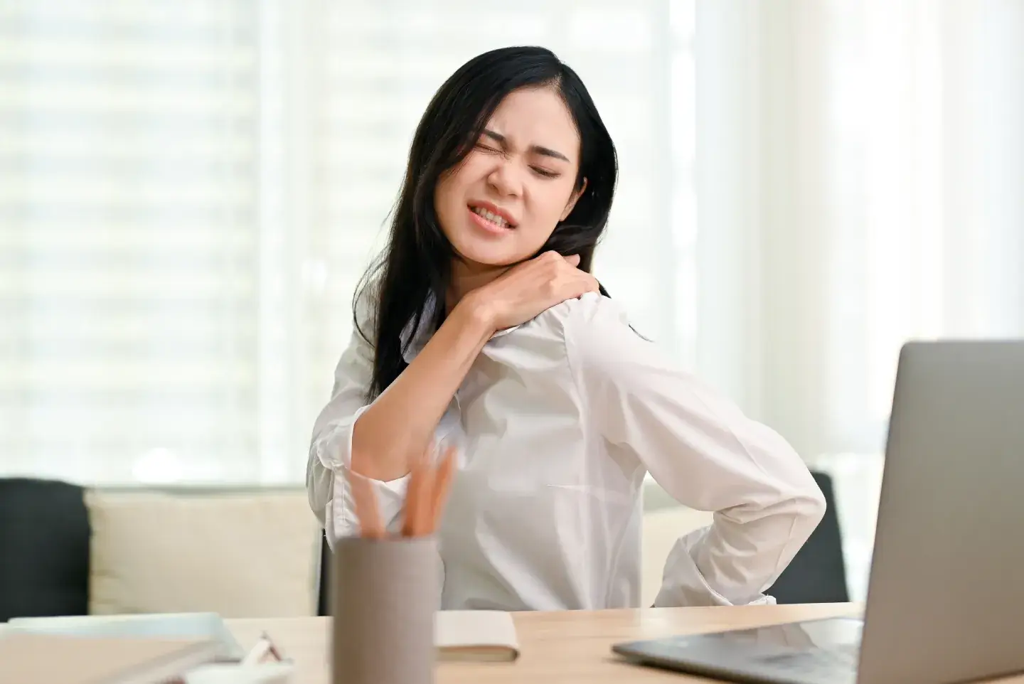 Hunching over your screen? That forward head posture strains your neck and shoulders, often leading to tension headaches.